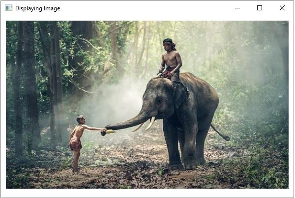 import java.io.FileInputStream; import java.io.IOException; import java.io.InputStream; import javafx.application.Application; import javafx.scene.Group; import javafx.scene.Scene; import javafx.scene.image.Image; import javafx.scene.image.ImageView; import javafx.stage.Stage; public class ImageViewExample extends Application { public void start(Stage stage) throws IOException { //creating the image object InputStream stream = new FileInputStream("D:\images\elephant.jpg"); Image image = new Image(stream); //Creating the image view ImageView imageView = new ImageView(); //Setting image to the image view imageView.setImage(image); //Setting the image view parameters imageView.setX(10); imageView.setY(10); imageView.setFitWidth(575); imageView.setPreserveRatio(true); //Setting the Scene object Group root = new Group(imageView); Scene scene = new Scene(root, 595, 370); stage.setTitle("Displaying Image"); stage.setScene(scene); stage.show(); } public static void main(String args[]) { launch(args); } }