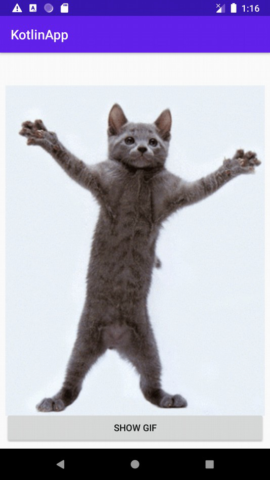 <?xml version="1.0" encoding="utf-8"?> <RelativeLayout xmlns:android="http://schemas.android.com/apk/res/android" xmlns:tools="http://schemas.android.com/tools" android:layout_width="match_parent" android:layout_height="match_parent" android:padding="8dp" tools:context=".MainActivity"> <ImageView android:id="@+id/imageView" android:layout_width="match_parent" android:layout_height="match_parent" /> <Button android:layout_width="match_parent" android:layout_height="wrap_content" android:layout_alignParentBottom="true" android:onClick="showGif" android:text="SHOW GIF" android:textAlignment="center" /> </RelativeLayout>