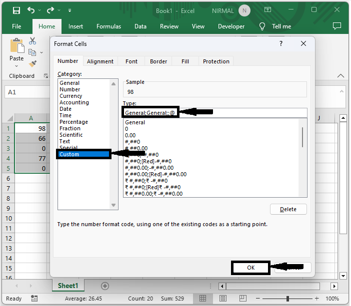 然後單擊“自定義”,並將型別輸入為“常規;常規;;@”,然後單擊“確定”以完成任務。