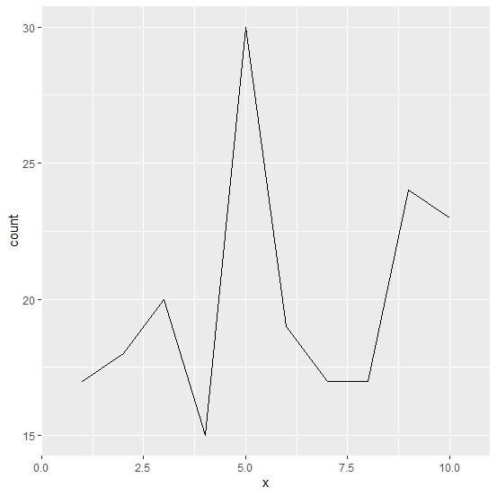 x<-sample(1:10,200,replace=TRUE) df<-data.frame(x) library(ggplot2) ggplot(df,aes(x))+geom_line(aes(fill=..count..),stat="bin",binwidth=1) Warning message: Ignoring unknown aesthetics: fill