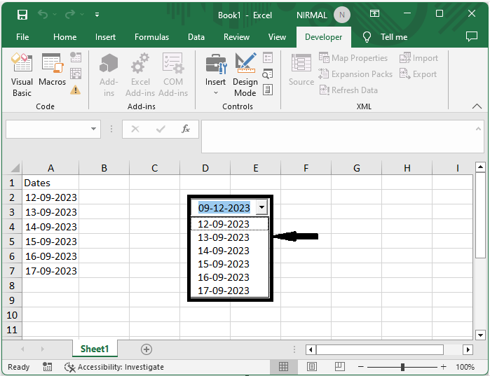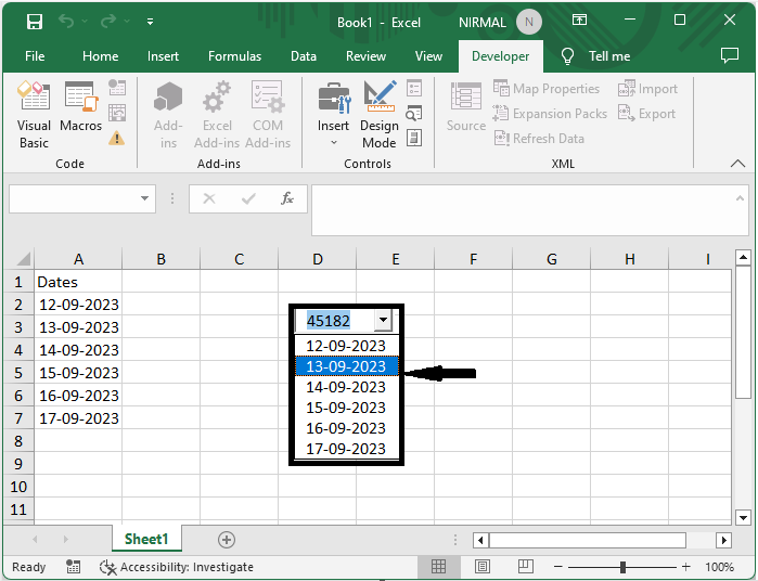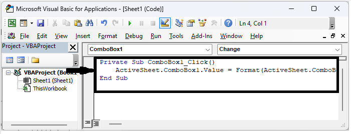 在這裡,我們將向組合框新增 VBA 程式碼以完成任務。因此,讓我們瞭解一個簡單的過程,瞭解如何在 Excel 中的組合框輸出中顯示日期格式。