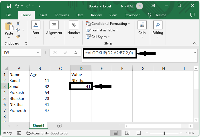 =VLOOKUP(D2,A2:B7,2,0) 並單擊回車鍵以完成任務。在此公式中,D2 是要根據其查詢的單元格的地址,A2:B7 是單元格範圍,2 表示查詢前兩列的值。