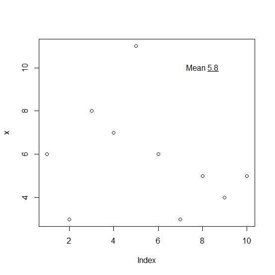 text(8,10,bquote("Mean"~underline(.(mean(x)))))