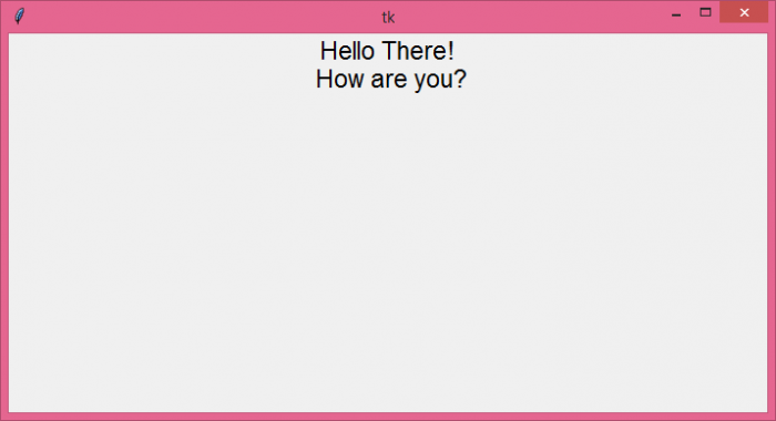 # Import the tkinter library from tkinter import * # Create an instance of tkinter frame win= Tk() # Set the size of the Tkinter window win.geometry("700x350") # Add a label widget label= Label(win, text= "Hello There!\n How are you?", font= ('Aerial', 17)) label.pack() win.mainloop()