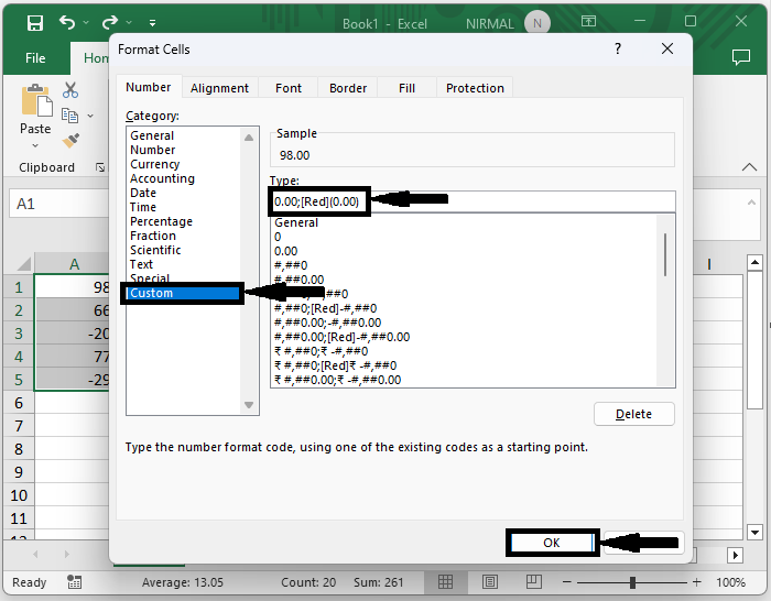 然後從列表中單擊“自定義”,並將型別輸入為 `0.00;[Red](0.00)`,然後單擊“確定”以完成任務。這將以括號顯示負數。