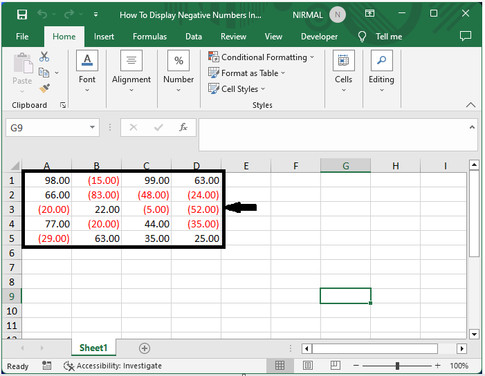 然後您可以看到所有負數都將顯示在括號內,並且減號將被移除。