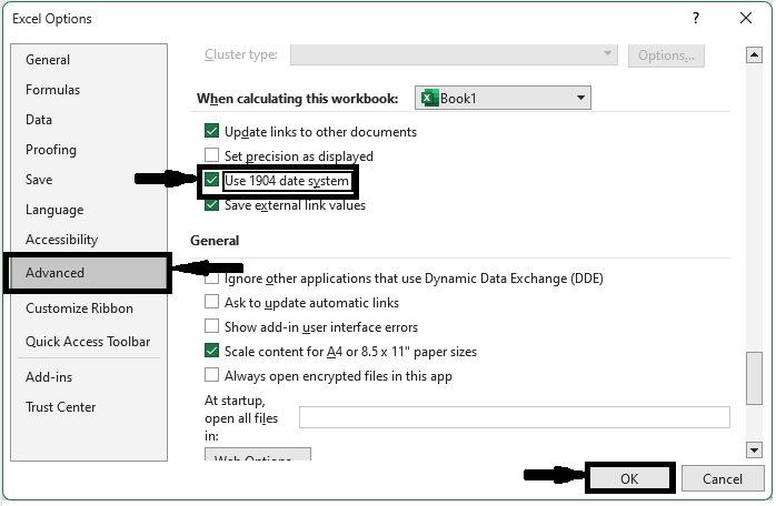 然後單擊“高階”,選中名為“使用 1904 日期系統”的複選框,然後單擊“確定”以完成任務。