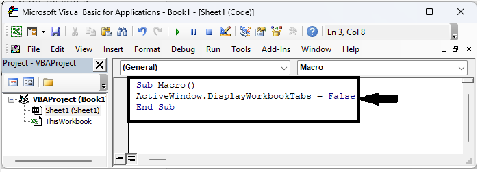 在這裡,我們將首先建立一個 VBA 模組,然後執行它來完成任務。因此,讓我們看看一個簡單的過程,瞭解如何在 Excel 中顯示或隱藏工作表選項卡和工作表選項卡欄。