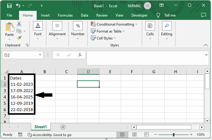 考慮一個 Excel 表格,其中您有一系列類似於下圖的日期。
