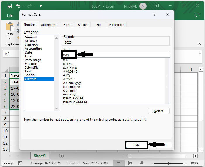 然後單擊“自定義”,在“型別”中輸入“yyy”,然後單擊“確定”以完成任務。