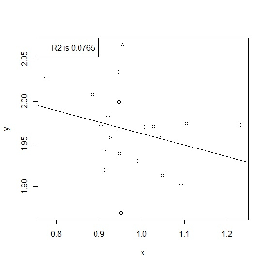 Estimate Std. Error t value Pr(>|t|) (Intercept) 2.0971 0.1084 19.349 1.7e-13 *** x -0.1350 0.1105 -1.221 0.238 --- Signif. codes: 0 ‘***’ 0.001 ‘**’ 0.01 ‘*’ 0.05 ‘.’ 0.1 ‘ ’ 1 Residual standard error: 0.04689 on 18 degrees of freedom Multiple R-squared: 0.07649, Adjusted R-squared: 0.02519 F-statistic: 1.491 on 1 and 18 DF, p-value: 0.2378