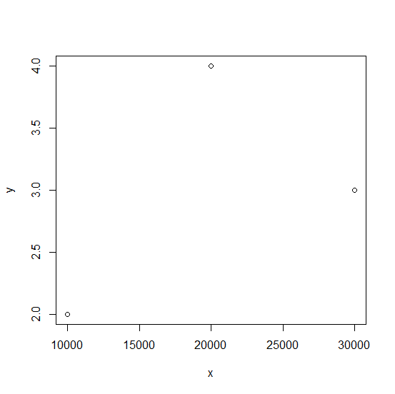 > x<-c(10000,20000,30000) > y<-rpois(3,2) > plot(x,y)