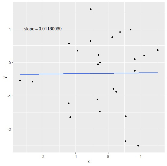 x<-rnorm(25) y<-rnorm(25) df<-data.frame(x,y) coef(lm(df$y~df$x))[2]