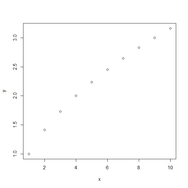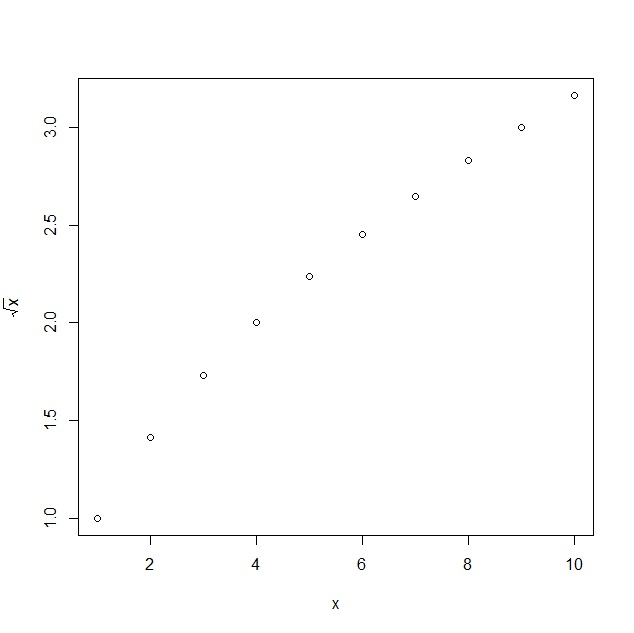 x<-1:10 y<-sqrt(x) plot(x,y)