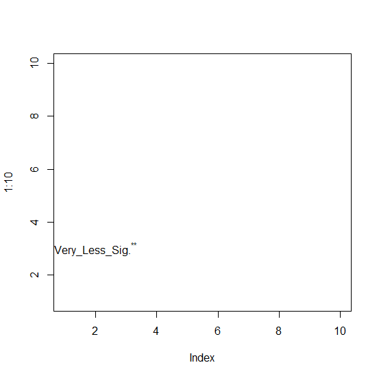 > plot(1:10,type="n") > text(2,3,expression(paste(Very_Less_Sig.^"**")))
