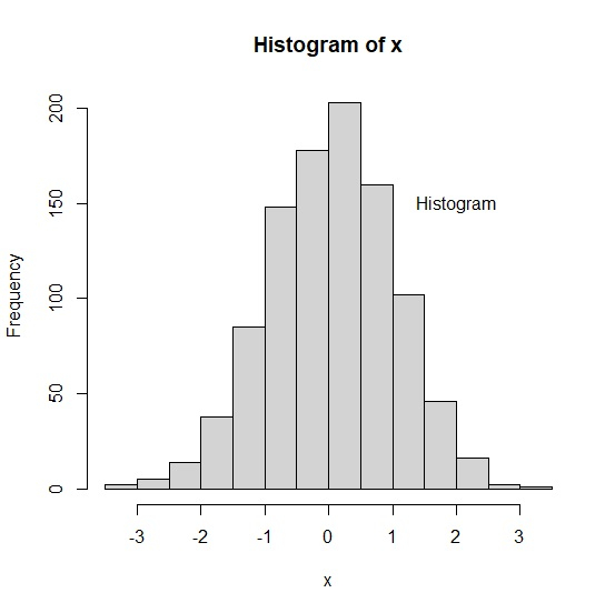 x<-rnorm(1000) hist(x) text(x=2,y=150,"Histogram")