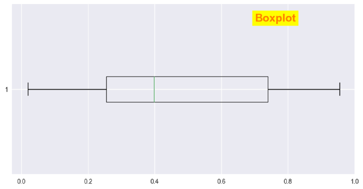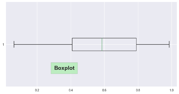 import pandas as pd import matplotlib.pyplot as plt import seaborn as sns import numpy as np plt.style.use('seaborn') df = pd.DataFrame(np.random.rand(25, 4), columns=['A', 'B', 'C', 'D']) plt.figure(figsize=(10, 5)) plt.boxplot(df['B'], vert=False) plt.text(0.3, 0.7, 'Boxplot', fontsize=18, fontweight='bold', bbox={'facecolor': 'lightgreen', 'pad': 10, 'alpha': 0.5}) plt.show()