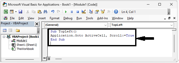 這裡我們將建立一個 VBA 模組,然後執行它來完成任務。因此,讓我們瞭解一個簡單的過程,瞭解如何將活動單元格顯示在 Excel 螢幕的左上角。