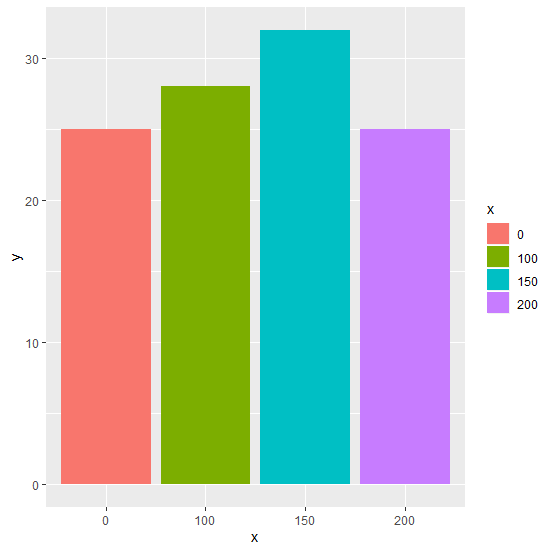 > library(ggplot2) > ggplot(df,aes(x,y,fill=x))+geom_bar(stat="identity")