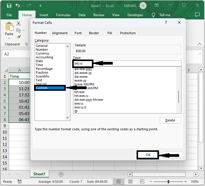然後單擊“自定義”,將型別輸入為“[m]:ss”,然後單擊“確定”以完成任務。
