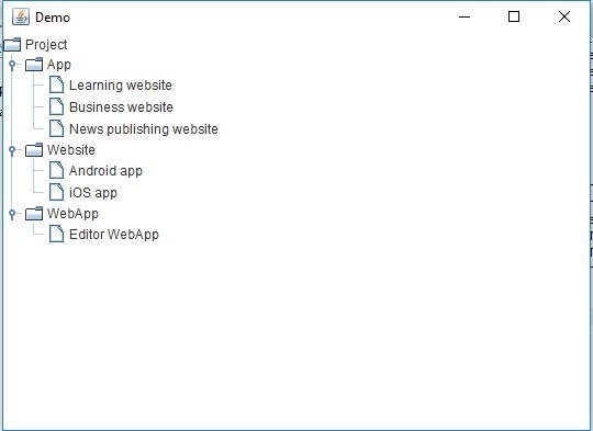 package my; import javax.swing.JFrame; import javax.swing.JTree; import javax.swing.tree.DefaultMutableTreeNode; public class SwingDemo { public static void main(String[] args) throws Exception { JFrame frame = new JFrame("Demo"); DefaultMutableTreeNode node = new DefaultMutableTreeNode("Project"); DefaultMutableTreeNode node1 = new DefaultMutableTreeNode("App"); DefaultMutableTreeNode node2 = new DefaultMutableTreeNode("Website"); DefaultMutableTreeNode node3 = new DefaultMutableTreeNode("WebApp"); node.add(node1); node.add(node2); node.add(node3); DefaultMutableTreeNode one = new DefaultMutableTreeNode("Learning website"); DefaultMutableTreeNode two = new DefaultMutableTreeNode("Business website"); DefaultMutableTreeNode three = new DefaultMutableTreeNode("News publishing website"); DefaultMutableTreeNode four = new DefaultMutableTreeNode("Android app"); DefaultMutableTreeNode five = new DefaultMutableTreeNode("iOS app"); DefaultMutableTreeNode six = new DefaultMutableTreeNode("Editor WebApp"); node1.add(one); node1.add(two); node1.add(three); node2.add(four); node2.add(five); node3.add(six); JTree tree = new JTree(node); frame.add(tree); frame.setSize(550,400); frame.setVisible(true); } }