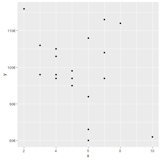 library(scales) ggplot(df)+geom_point(aes(x,y))+scale_y_continuous(labels=dollar_format(suffix="€",prefix=""))