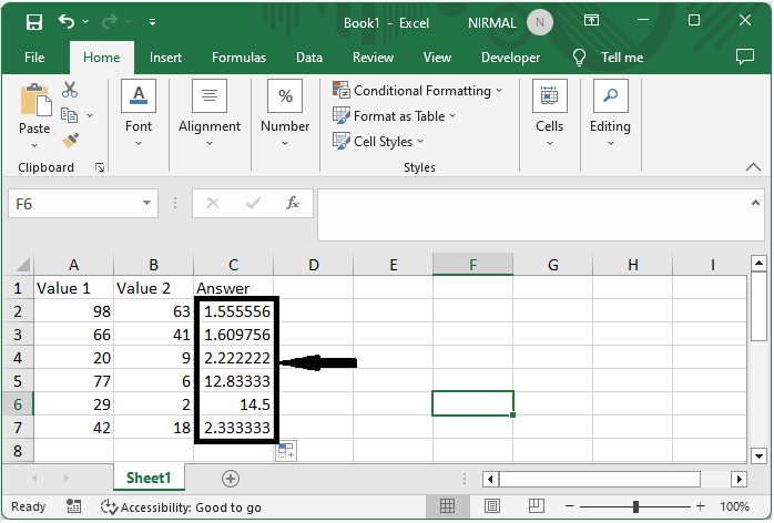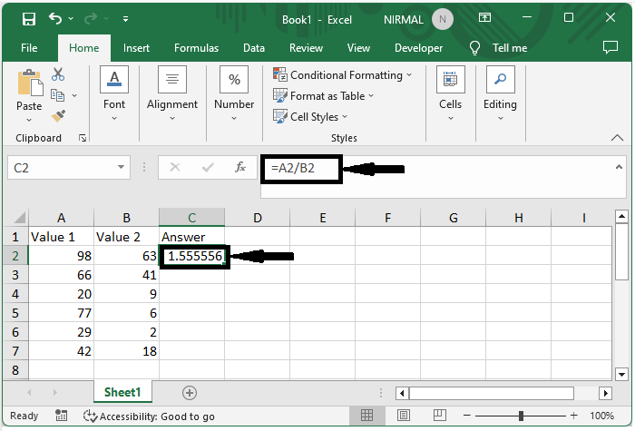 首先,單擊一個空單元格,在本例中為單元格 C2,然後輸入公式 =B2/A2 並單擊回車鍵。