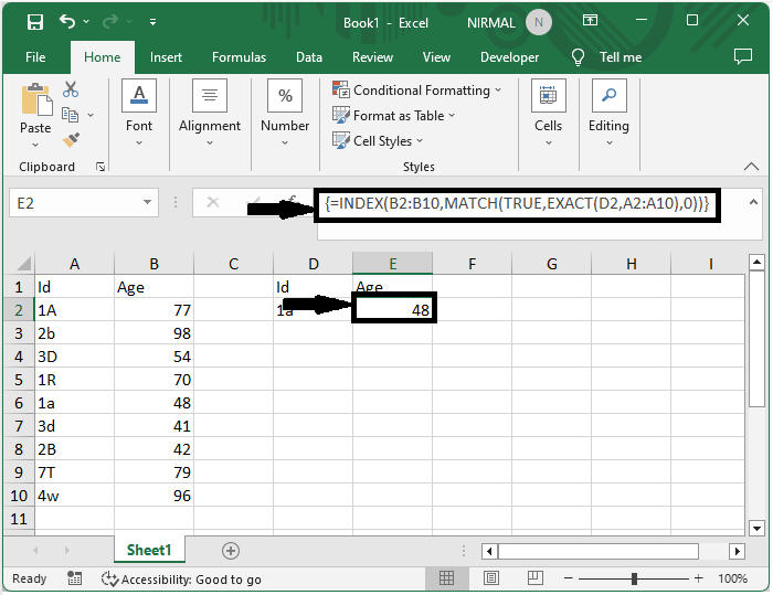 首先,單擊一個空單元格(在本例中為單元格E2),輸入公式`=INDEX(B2:B11,MATCH(TRUE,EXACT(D2,A2:A11),0))`,然後按Ctrl + Shift + Enter完成任務。在公式中,B2:B11和A2:A11是包含資料的單元格範圍,D2是我們正在查詢的內容。