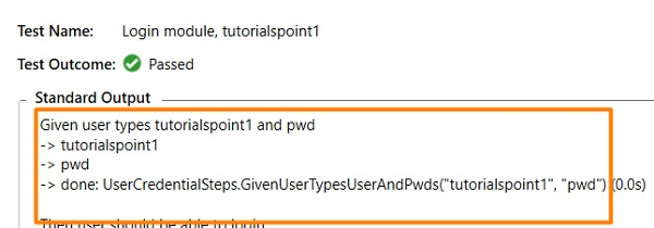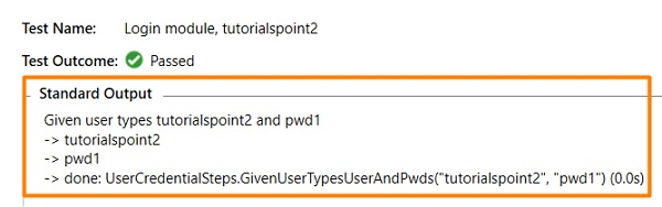 Feature: User credential Scenario Outline: Login module Given user types <username> and <password> Examples: | username | password | | tutorialspoint1| pwd | | tutorialspoint2| pwd1 |