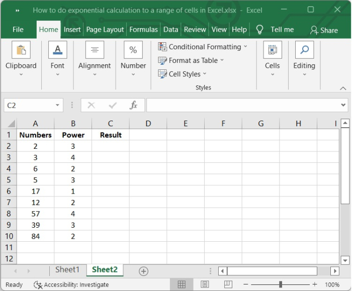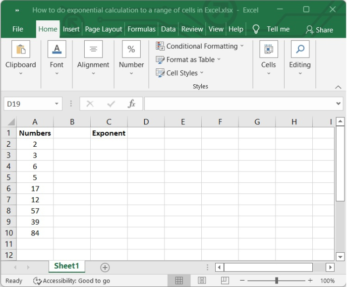 在我們的Excel表格示例中,包含一些整數及其要計算的冪。請檢視下圖。