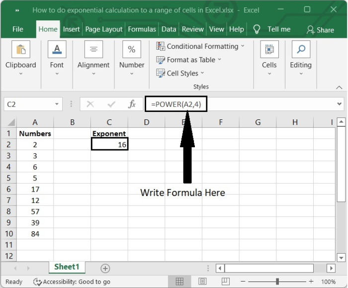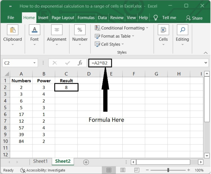 其中,A2和B2是寫入數字及其冪的單元格。