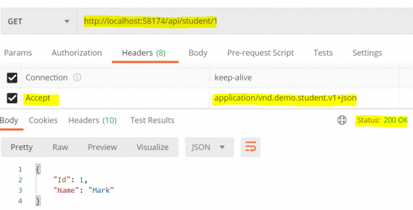 以下輸出顯示了使用自定義媒體型別處理 StudentV1 和 StudentV2 控制器時獲得的結果。