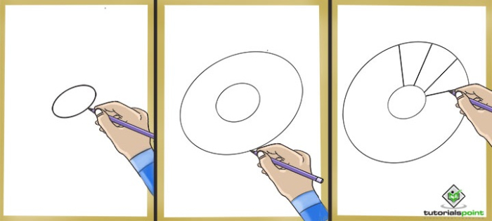 如果您想寫實地繪畫,請繪製一個水平橢圓形,在左側略微傾斜。在橢圓形的中心繪製另一個與之平行的橢圓形。在設計中新增兩條線,遠離花瓣,然後用曲線將它們連線起來。