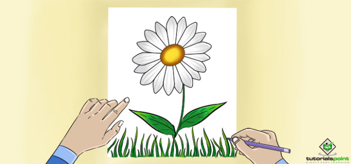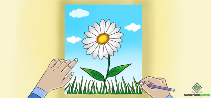 擦除外部橢圓形。從雛菊的中間畫出一根莖,並在莖的一側新增一片葉子。此時,顏色使它變得有趣。