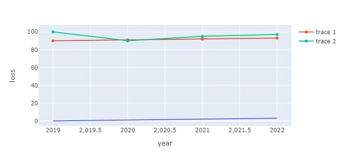 import plotly.express as px import pandas as pd # Create a dataset data = { 'year':[2019,2020,2021,2022], 'loss':[0,1,2,3], 'gain':[90,91,92,93], 'profit':[100,90,95,97] } df = pd.DataFrame(data) # generate the line plot fig = px.line(df, x='year', y='loss') # generate scatter plot fig.add_scatter(x=df['year'], y=df['gain']) fig.add_scatter(x=df['year'], y=df['profit']) # Set the size of the plot fig.update_layout(width=716, height=350) # show the plot fig.show()