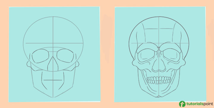 一旦有了基本的輪廓,就可以為骷髏頭新增細節了。首先勾勒出眼窩,然後新增鼻子和下巴線。然後畫出顴骨和額頭。最後,畫出牙齒和其他細節,例如皺紋和裂縫。