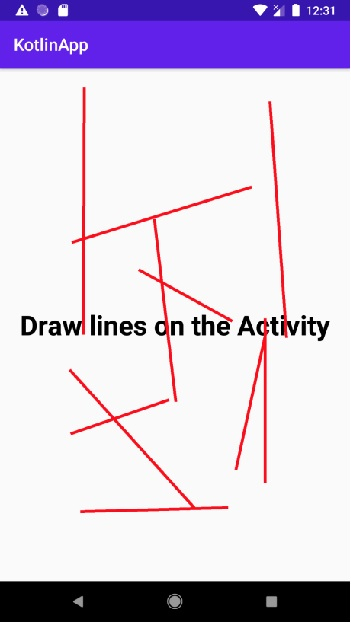 <?xml version="1.0" encoding="utf-8"?> <RelativeLayout xmlns:android="http://schemas.android.com/apk/res/android" xmlns:tools="http://schemas.android.com/tools" android:layout_width="match_parent" android:layout_height="match_parent" tools:context=".MainActivity"> <TextView android:layout_width="wrap_content" android:layout_height="wrap_content" android:layout_centerInParent="true" android:text="Draw lines on the Activity" android:textAlignment="center" android:textColor="@android:color/background_dark" android:textSize="32sp" android:textStyle="bold" /> <ImageView android:id="@+id/imageView" android:layout_width="wrap_content" android:layout_height="match_parent" android:layout_alignParentStart="true" android:layout_alignParentTop="true" android:layout_alignParentEnd="true" android:contentDescription="TODO" /> </RelativeLayout>