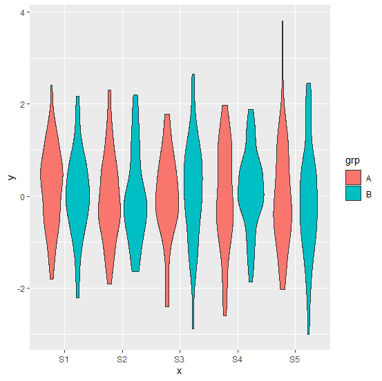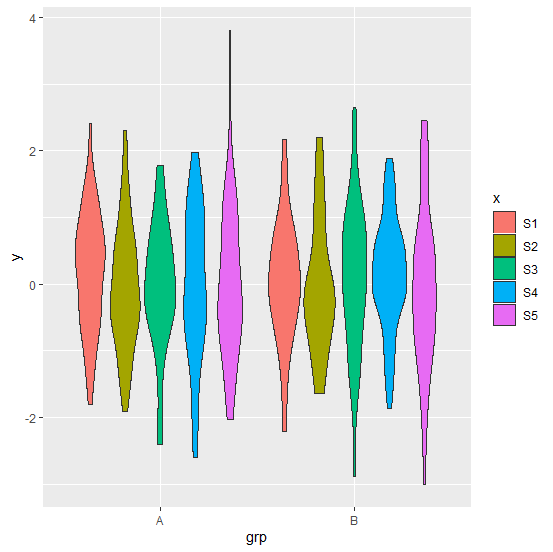 ggplot(df,aes(grp,y,fill=x))+geom_violin()