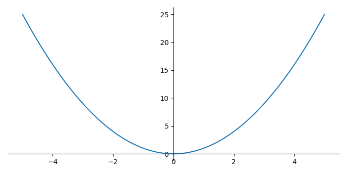 import numpy as np import matplotlib.pyplot as plt plt.rcParams["figure.figsize"] = [7.00, 3.50] plt.rcParams["figure.autolayout"] = True fig = plt.figure() x = np.linspace(-5, 5, 100) ax = fig.add_subplot(111) ax.plot(x, x*x) ax.spines['left'].set_position('zero') ax.spines['right'].set_color('none') ax.spines['bottom'].set_position('zero') ax.spines['top'].set_color('none') plt.show()