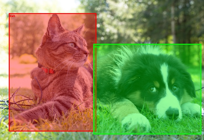 import torch import torchvision from torchvision.io import read_image from torchvision.utils import draw_bounding_boxes img = read_image('catndog.png') # bounding box in (xmin, ymin, xmax, ymax) format bbox1 = [30, 45, 330, 450] bbox2 = [320, 150, 690, 460] bbox = [bbox1, bbox2] labels = ['Cat', 'Dog'] bbox = torch.tensor(bbox, dtype=torch.int) print(bbox) print(bbox.size()) # draw bounding boxes with fill color img=draw_bounding_boxes(img, bbox,width=3,labels= labels,colors=[(255,0,0),(0,255,0)],fill =True,font_size=20) img = torchvision.transforms.ToPILImage()(img) img.show()
