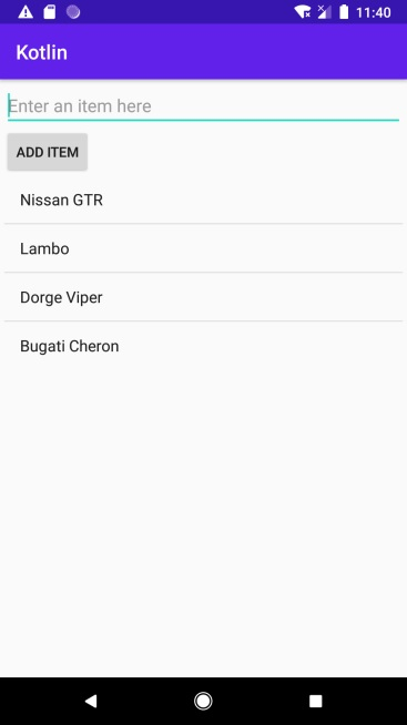 import androidx.appcompat.app.AppCompatActivity import android.os.Bundle import android.widget.ArrayAdapter import android.widget.Button import android.widget.EditText import android.widget.ListView class MainActivity : AppCompatActivity() { lateinit var editText: EditText lateinit var button: Button lateinit var listView: ListView var list: ArrayList<String> = ArrayList() lateinit var arrayAdapter: ArrayAdapter<String> override fun onCreate(savedInstanceState: Bundle?) { super.onCreate(savedInstanceState) setContentView(R.layout.activity_main) title = "Kotlin" listView = findViewById(R.id.listView) editText = findViewById(R.id.editText) button = findViewById(R.id.btnAdd) arrayAdapter = ArrayAdapter(this, android.R.layout.simple_list_item_1, list) button.setOnClickListener { list.add(editText.text.toString()) editText.setText("") arrayAdapter.notifyDataSetChanged() listView.adapter = arrayAdapter } } }
