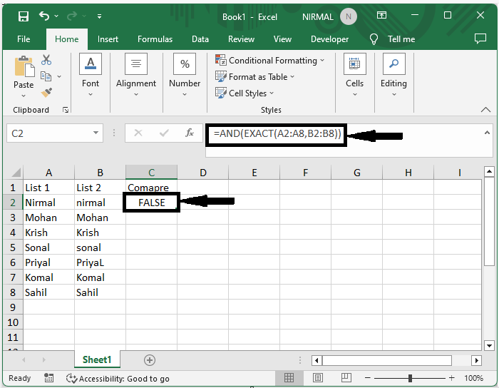 首先,要區分大小寫地比較單元格,請單擊一個空單元格並輸入公式 =AND(EXACT(A2:A8,B2:B8)),然後單擊回車鍵以獲取第一個值。
