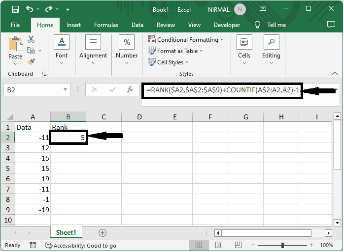 =RANK($B2,$B$2:$B$9)+COUNTIF(B$2:B2,B2)−1 並單擊回車鍵以獲取第一個值的排名。在公式 B2:B9 中,單元格範圍包含分數。