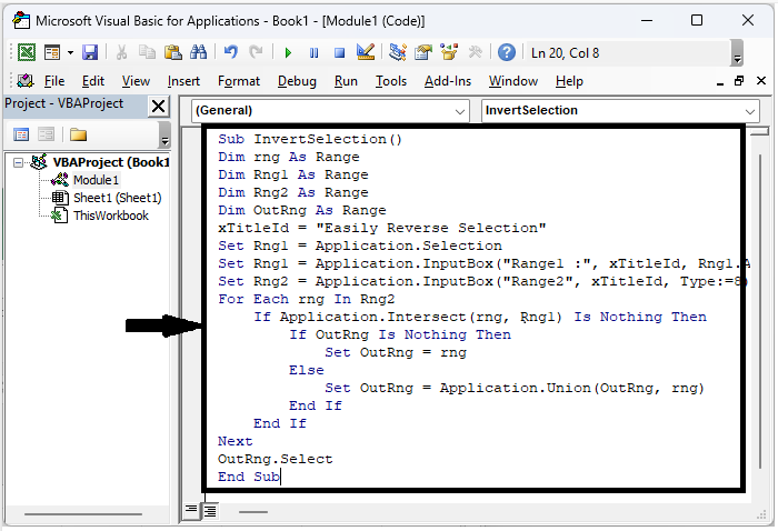 在這裡,我們將首先建立一個VBA模組,然後執行它並選擇單元格區域來完成任務。讓我們來看一個簡單的過程,學習如何在Excel中輕鬆反轉選定區域的選擇。