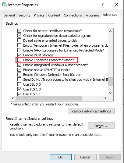 Internet Explorer → Internet 選項 → 高階 → 啟用增強保護模式
