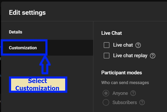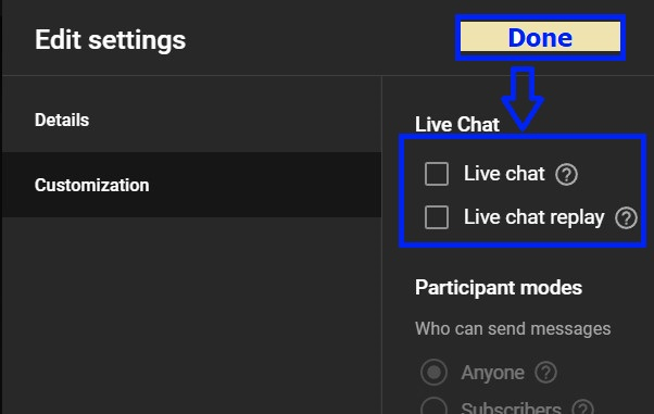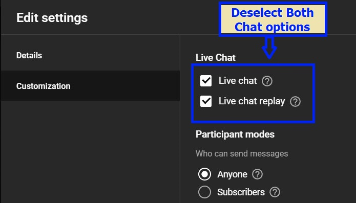 點選“自定義”,取消選中“即時聊天”選項以在直播過程中停用聊天。