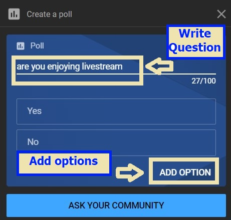 填寫並編寫投票問題。如果您想新增更多選項,在“是”和“否”旁邊點選“新增選項”。