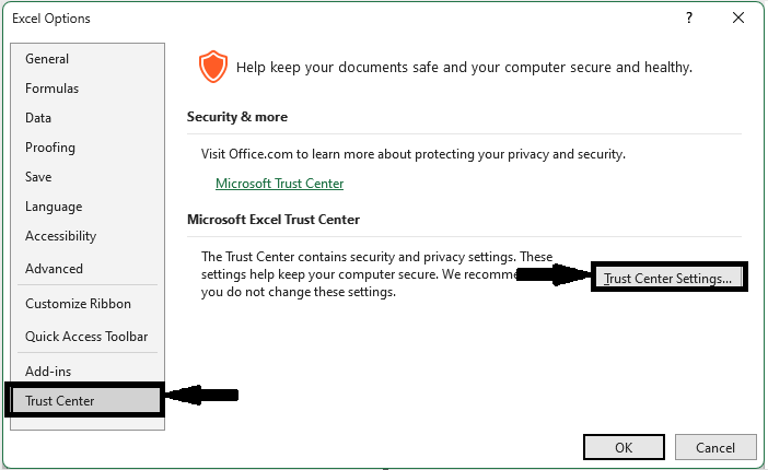 然後單擊“信任中心”,再單擊“信任中心設定”。