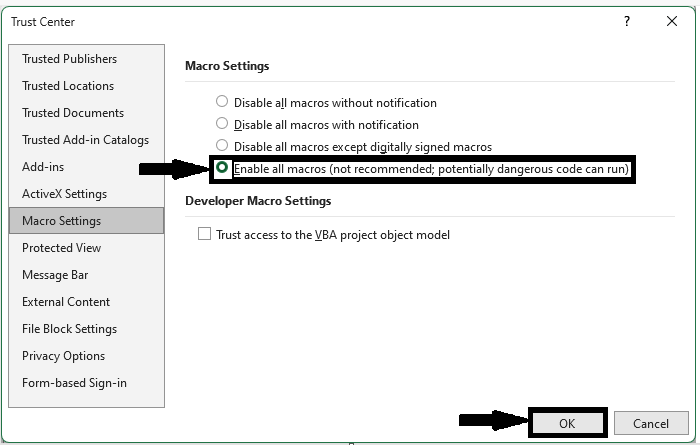 然後單擊“宏設定”,選擇“啟用所有宏”,然後單擊“確定”和“確定”以完成任務。