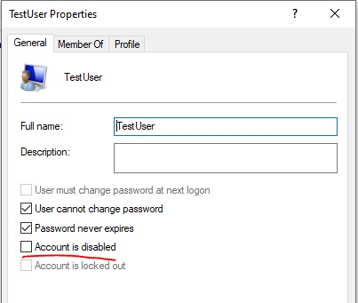 Net user testuser /active:yes